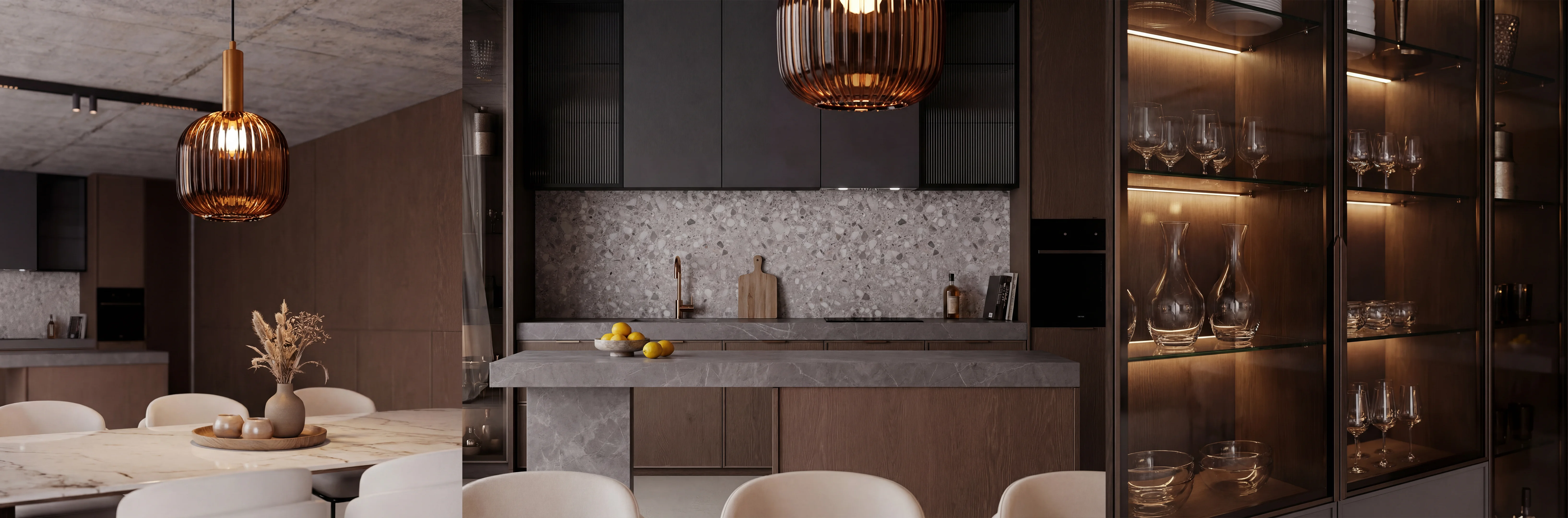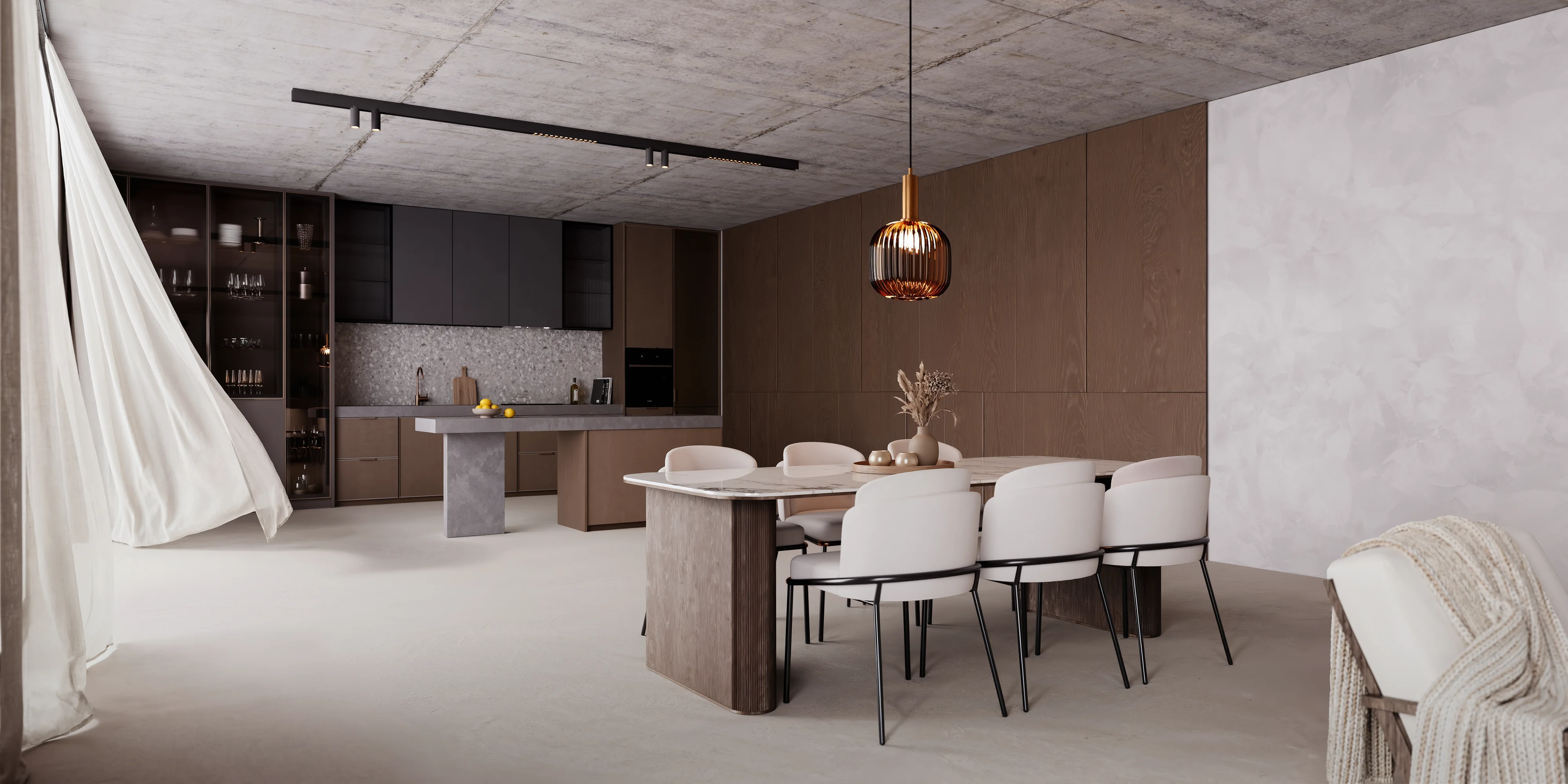 Interior renders for a private coastal residence, exploring concrete, oak and copper materiality within the living room space. To complement the architectural intent, we produced a series of interior renders to give the client a clear understanding of how the space would feel once realised. The visuals focus on proportion, materiality, and light, translating the design concept into a tangible living environment and supporting confident design and marketing decisions early in the process.