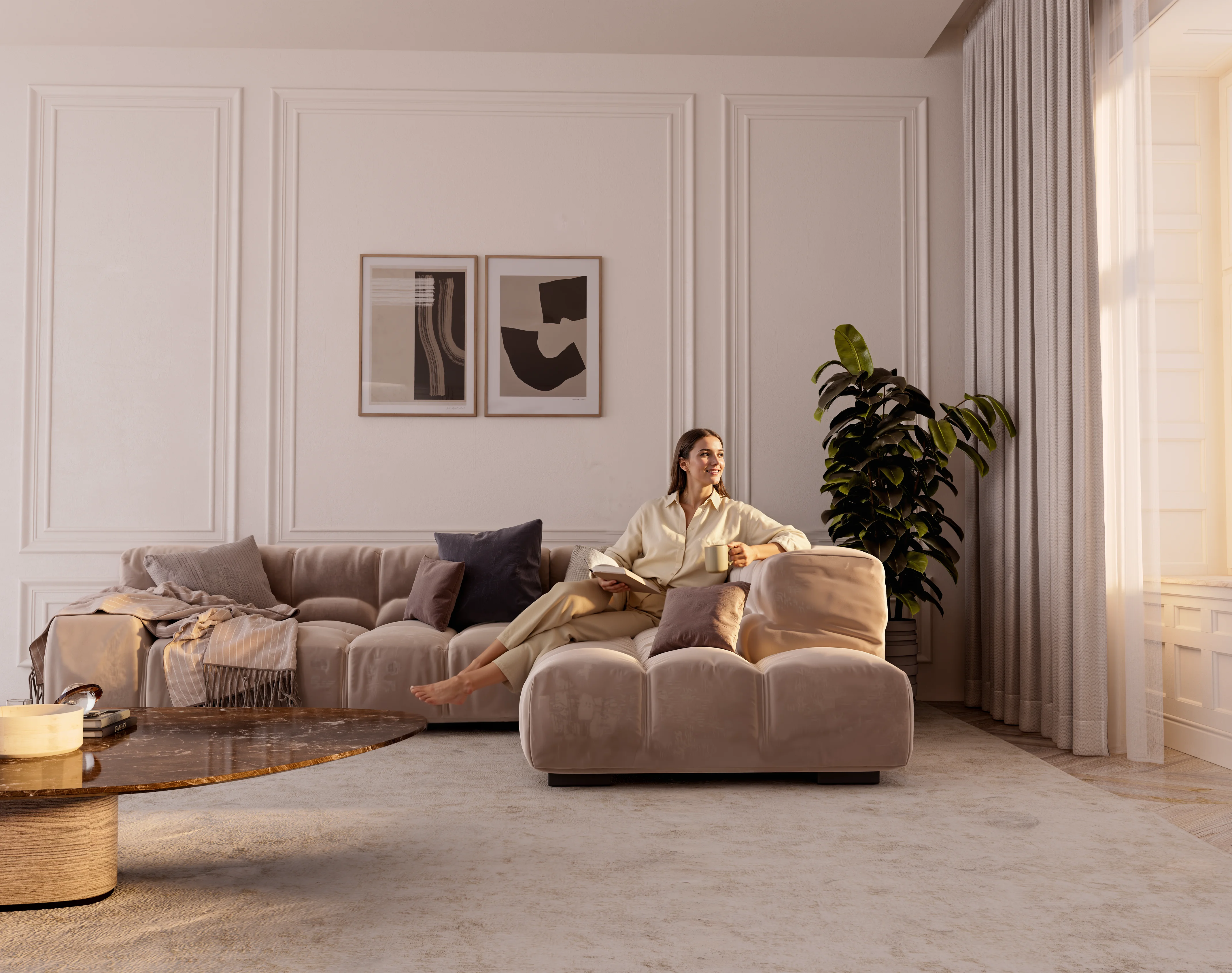 Interior renders for a Vienna city apartment, exploring herringbone timber floors, white moulded walls and copper detail within an open-plan living and dining space. The afternoon light through floor-to-ceiling windows was central to the composition. We produced a series of visuals to give the client a clear understanding of how the space would feel once realised, focusing on proportion, natural light and materiality.